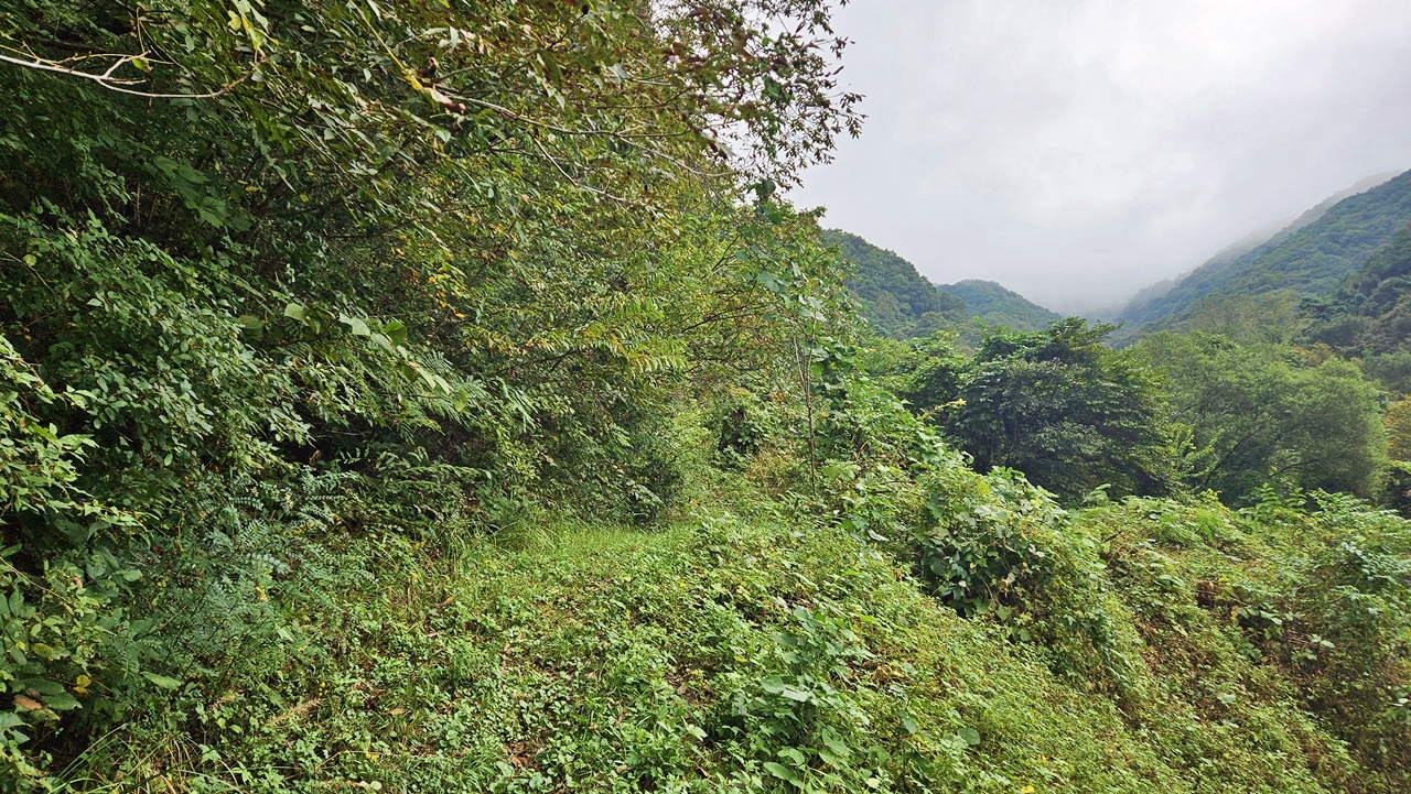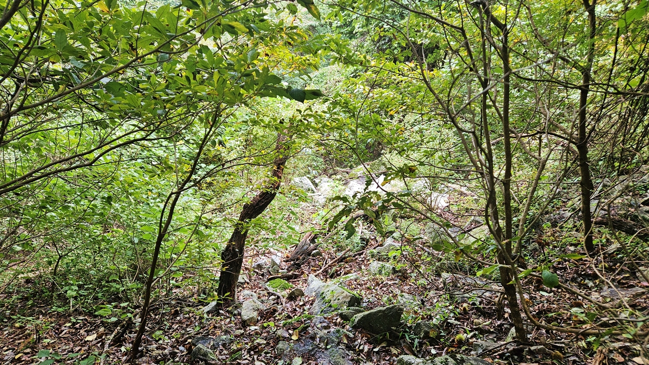 실제 두랭이골로 접어드는 산길은 계곡 아래로 갈라지지만 산죽과 잡목이 뒤덥다시피 묵어 아예 길 흔적 자체가 보이지 않는다.
