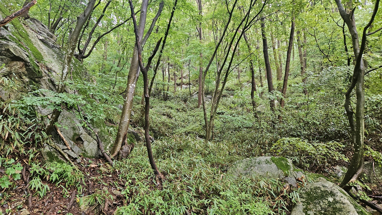 단풍나무 군락지를 지나 랜드마크격인 평상바위 바로 위 삼거리에서 비스듬이 우측으로 길을 잡으면 왕가지터다.