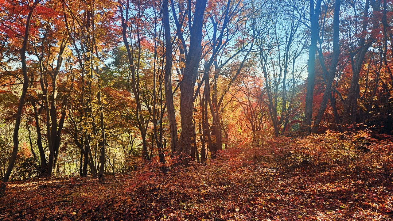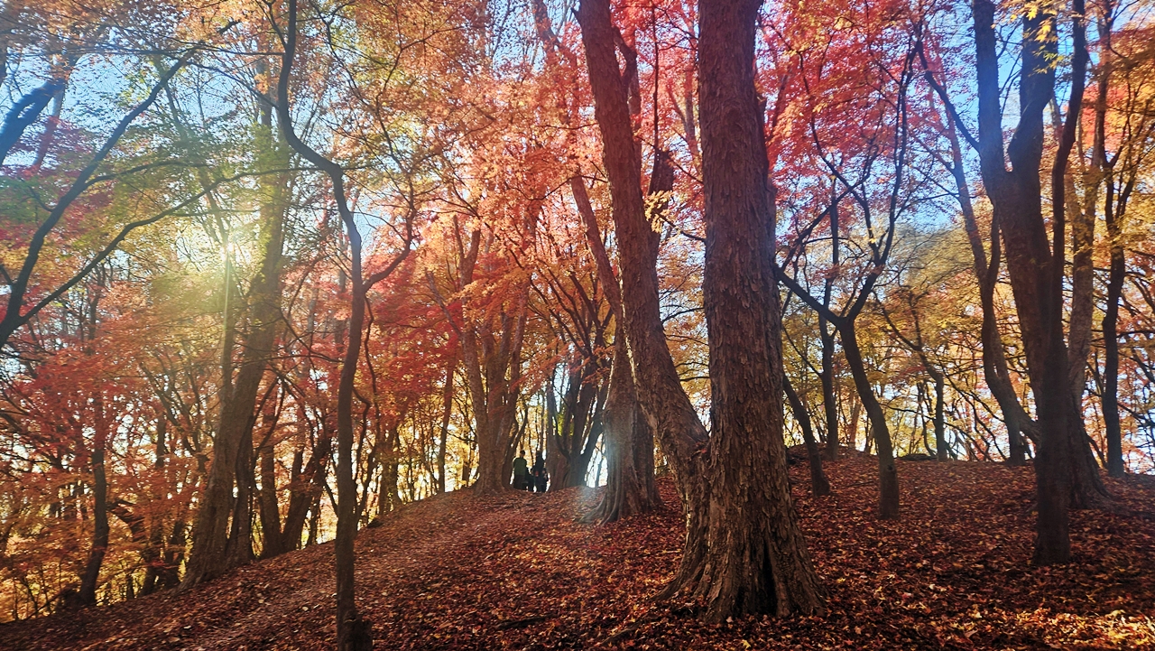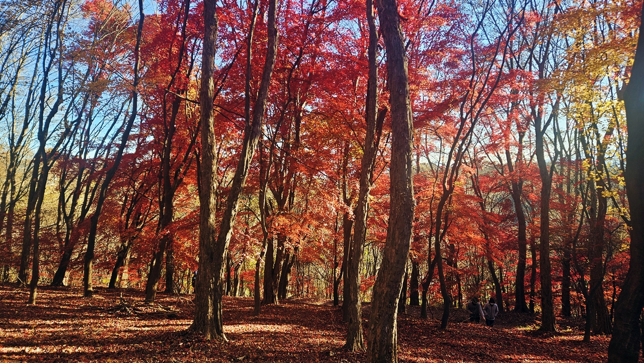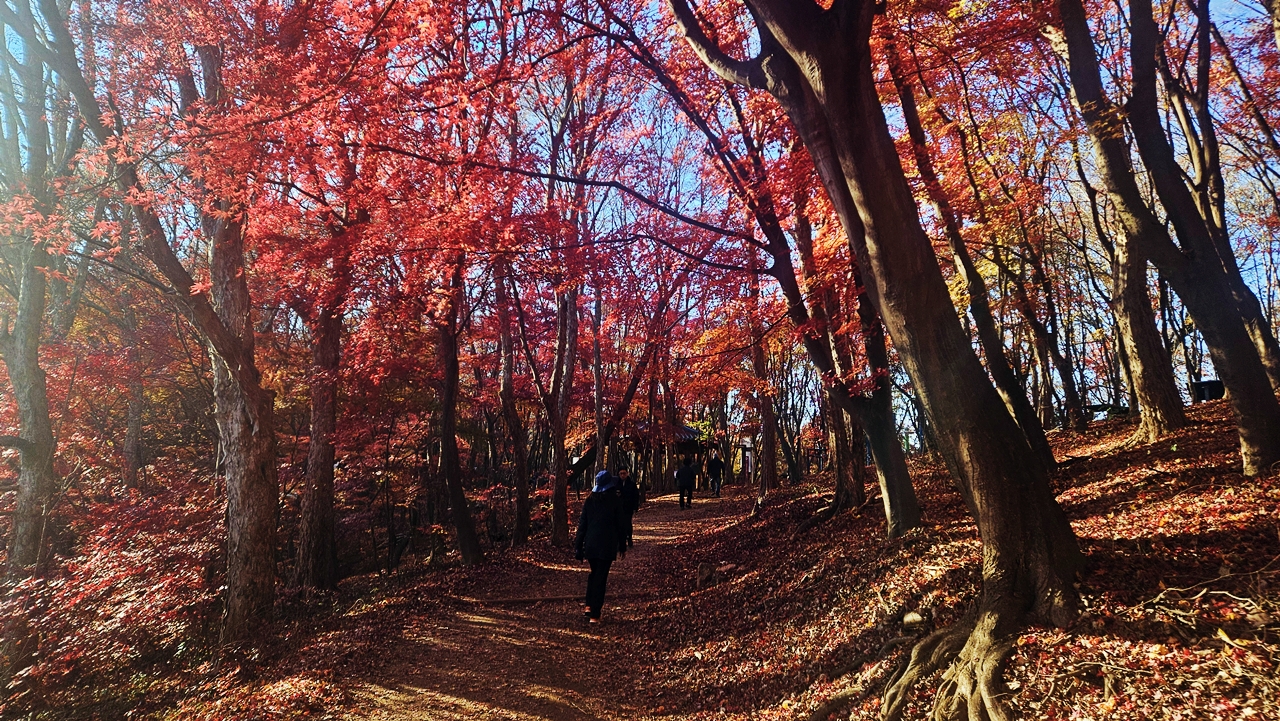 기온이 내려가는 해넘이 시간 때라 화사함은 덜했지만 붉게 물든 주홍빛 단풍이 떠나가는 가을을 붙들고 있었다.