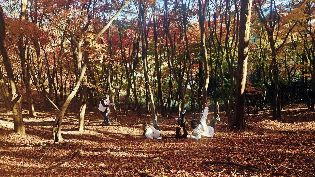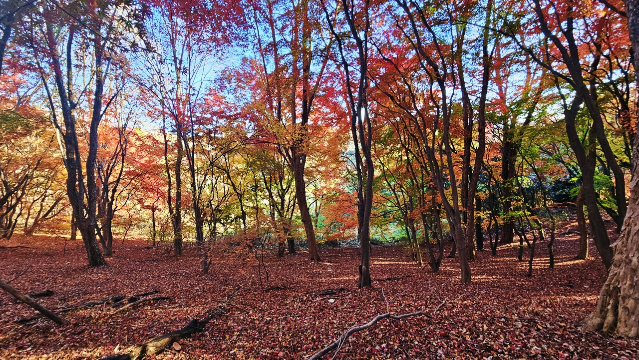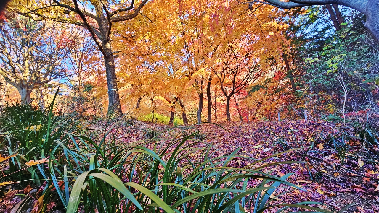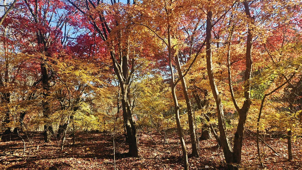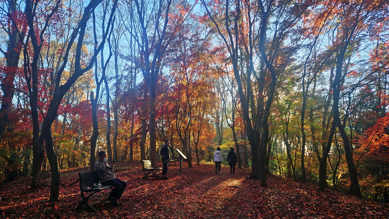 기온이 내려가는 해넘이 시간 때라 화사함은 덜했지만 붉게 물든 주홍빛 단풍이 떠나가는 가을을 붙들고 있었다.